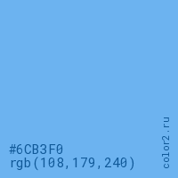 Цвет #6CB3F0 в цветовой модели RGB обозначается тремя октетами (108, 179, 240) в десятичном формате и #6CB3F0 в шестнадцатиричном (hex) формате, которые являются интенсивностью красного 108 (hex 6C), интенсивность зелёного 179 (hex B3) и интенсивность синего 240 (hex F0).