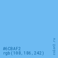 Цвет RGB(108, 186, 242) в процентом отношении количества цвета состоит из 42.4% красного (red), 72.9% зелёного (green) и 94.9% синего (blue).