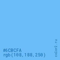Цвет RGB(108, 188, 250) в процентом отношении количества цвета состоит из 42.4% красного (red), 73.7% зелёного (green) и 98% синего (blue).