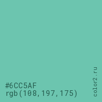 Цвет #6CC5AF в цветовой модели RGB обозначается тремя октетами (108, 197, 175) в десятичном формате и #6CC5AF в шестнадцатиричном (hex) формате, которые являются интенсивностью красного 108 (hex 6C), интенсивность зелёного 197 (hex C5) и интенсивность синего 175 (hex AF).