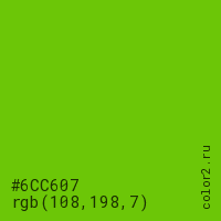 Цвет #6CC607 в цветовой модели RGB обозначается тремя октетами (108, 198, 7) в десятичном формате и #6CC607 в шестнадцатиричном (hex) формате, которые являются интенсивностью красного 108 (hex 6C), интенсивность зелёного 198 (hex C6) и интенсивность синего 7 (hex 07).