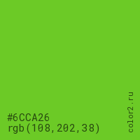 Цвет #6CCA26 в цветовой модели RGB обозначается тремя октетами (108, 202, 38) в десятичном формате и #6CCA26 в шестнадцатиричном (hex) формате, которые являются интенсивностью красного 108 (hex 6C), интенсивность зелёного 202 (hex CA) и интенсивность синего 38 (hex 26).