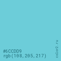 Цвет #6CCDD9 в цветовой модели RGB обозначается тремя октетами (108, 205, 217) в десятичном формате и #6CCDD9 в шестнадцатиричном (hex) формате, которые являются интенсивностью красного 108 (hex 6C), интенсивность зелёного 205 (hex CD) и интенсивность синего 217 (hex D9).