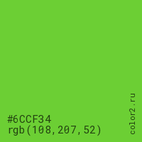 Цвет #6CCF34 в цветовой модели RGB обозначается тремя октетами (108, 207, 52) в десятичном формате и #6CCF34 в шестнадцатиричном (hex) формате, которые являются интенсивностью красного 108 (hex 6C), интенсивность зелёного 207 (hex CF) и интенсивность синего 52 (hex 34).
