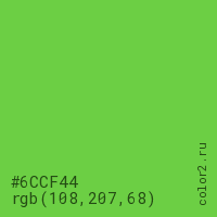 Цвет #6CCF44 в цветовой модели RGB обозначается тремя октетами (108, 207, 68) в десятичном формате и #6CCF44 в шестнадцатиричном (hex) формате, которые являются интенсивностью красного 108 (hex 6C), интенсивность зелёного 207 (hex CF) и интенсивность синего 68 (hex 44).