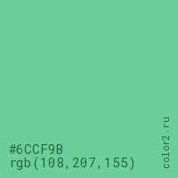 Цвет RGB(108, 207, 155) в процентом отношении количества цвета состоит из 42.4% красного (red), 81.2% зелёного (green) и 60.8% синего (blue).