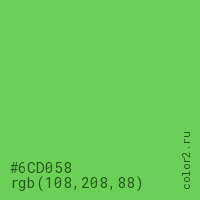 Цвет #6CD058 в цветовой модели RGB обозначается тремя октетами (108, 208, 88) в десятичном формате и #6CD058 в шестнадцатиричном (hex) формате, которые являются интенсивностью красного 108 (hex 6C), интенсивность зелёного 208 (hex D0) и интенсивность синего 88 (hex 58).
