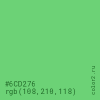 Цвет #6CD276 в цветовой модели RGB обозначается тремя октетами (108, 210, 118) в десятичном формате и #6CD276 в шестнадцатиричном (hex) формате, которые являются интенсивностью красного 108 (hex 6C), интенсивность зелёного 210 (hex D2) и интенсивность синего 118 (hex 76).