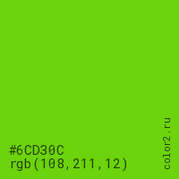 Цвет #6CD30C в цветовой модели RGB обозначается тремя октетами (108, 211, 12) в десятичном формате и #6CD30C в шестнадцатиричном (hex) формате, которые являются интенсивностью красного 108 (hex 6C), интенсивность зелёного 211 (hex D3) и интенсивность синего 12 (hex 0C).