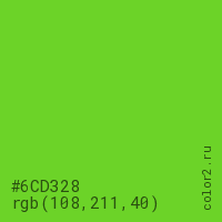 Цвет #6CD328 в цветовой модели RGB обозначается тремя октетами (108, 211, 40) в десятичном формате и #6CD328 в шестнадцатиричном (hex) формате, которые являются интенсивностью красного 108 (hex 6C), интенсивность зелёного 211 (hex D3) и интенсивность синего 40 (hex 28).