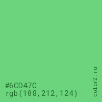 Цвет #6CD47C в цветовой модели RGB обозначается тремя октетами (108, 212, 124) в десятичном формате и #6CD47C в шестнадцатиричном (hex) формате, которые являются интенсивностью красного 108 (hex 6C), интенсивность зелёного 212 (hex D4) и интенсивность синего 124 (hex 7C).