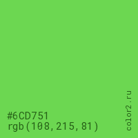 Цвет #6CD751 в цветовой модели RGB обозначается тремя октетами (108, 215, 81) в десятичном формате и #6CD751 в шестнадцатиричном (hex) формате, которые являются интенсивностью красного 108 (hex 6C), интенсивность зелёного 215 (hex D7) и интенсивность синего 81 (hex 51).