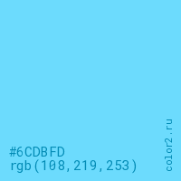 Цвет #6CDBFD в цветовой модели RGB обозначается тремя октетами (108, 219, 253) в десятичном формате и #6CDBFD в шестнадцатиричном (hex) формате, которые являются интенсивностью красного 108 (hex 6C), интенсивность зелёного 219 (hex DB) и интенсивность синего 253 (hex FD).
