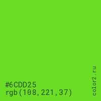 Цвет #6CDD25 в цветовой модели RGB обозначается тремя октетами (108, 221, 37) в десятичном формате и #6CDD25 в шестнадцатиричном (hex) формате, которые являются интенсивностью красного 108 (hex 6C), интенсивность зелёного 221 (hex DD) и интенсивность синего 37 (hex 25).