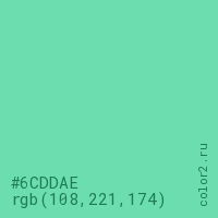 Цвет RGB(108, 221, 174) в процентом отношении количества цвета состоит из 42.4% красного (red), 86.7% зелёного (green) и 68.2% синего (blue).