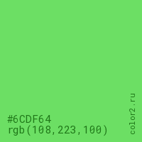 Цвет #6CDF64 в цветовой модели RGB обозначается тремя октетами (108, 223, 100) в десятичном формате и #6CDF64 в шестнадцатиричном (hex) формате, которые являются интенсивностью красного 108 (hex 6C), интенсивность зелёного 223 (hex DF) и интенсивность синего 100 (hex 64).