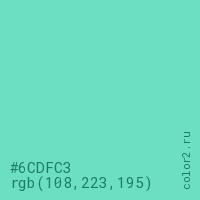 Цвет #6CDFC3 в цветовой модели RGB обозначается тремя октетами (108, 223, 195) в десятичном формате и #6CDFC3 в шестнадцатиричном (hex) формате, которые являются интенсивностью красного 108 (hex 6C), интенсивность зелёного 223 (hex DF) и интенсивность синего 195 (hex C3).