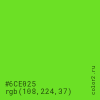 Цвет #6CE025 в цветовой модели RGB обозначается тремя октетами (108, 224, 37) в десятичном формате и #6CE025 в шестнадцатиричном (hex) формате, которые являются интенсивностью красного 108 (hex 6C), интенсивность зелёного 224 (hex E0) и интенсивность синего 37 (hex 25).