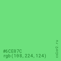 Цвет #6CE07C в цветовой модели RGB обозначается тремя октетами (108, 224, 124) в десятичном формате и #6CE07C в шестнадцатиричном (hex) формате, которые являются интенсивностью красного 108 (hex 6C), интенсивность зелёного 224 (hex E0) и интенсивность синего 124 (hex 7C).