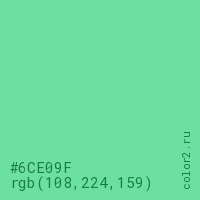 Цвет #6CE09F в цветовой модели RGB обозначается тремя октетами (108, 224, 159) в десятичном формате и #6CE09F в шестнадцатиричном (hex) формате, которые являются интенсивностью красного 108 (hex 6C), интенсивность зелёного 224 (hex E0) и интенсивность синего 159 (hex 9F).