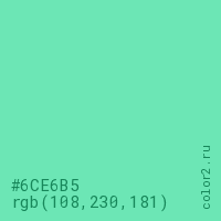 Цвет #6CE6B5 в цветовой модели RGB обозначается тремя октетами (108, 230, 181) в десятичном формате и #6CE6B5 в шестнадцатиричном (hex) формате, которые являются интенсивностью красного 108 (hex 6C), интенсивность зелёного 230 (hex E6) и интенсивность синего 181 (hex B5).