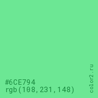 Цвет #6CE794 в цветовой модели RGB обозначается тремя октетами (108, 231, 148) в десятичном формате и #6CE794 в шестнадцатиричном (hex) формате, которые являются интенсивностью красного 108 (hex 6C), интенсивность зелёного 231 (hex E7) и интенсивность синего 148 (hex 94).