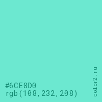 Цвет #6CE8D0 в цветовой модели RGB обозначается тремя октетами (108, 232, 208) в десятичном формате и #6CE8D0 в шестнадцатиричном (hex) формате, которые являются интенсивностью красного 108 (hex 6C), интенсивность зелёного 232 (hex E8) и интенсивность синего 208 (hex D0).