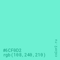Цвет #6CF0D2 в цветовой модели RGB обозначается тремя октетами (108, 240, 210) в десятичном формате и #6CF0D2 в шестнадцатиричном (hex) формате, которые являются интенсивностью красного 108 (hex 6C), интенсивность зелёного 240 (hex F0) и интенсивность синего 210 (hex D2).