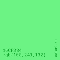 Цвет #6CF384 в цветовой модели RGB обозначается тремя октетами (108, 243, 132) в десятичном формате и #6CF384 в шестнадцатиричном (hex) формате, которые являются интенсивностью красного 108 (hex 6C), интенсивность зелёного 243 (hex F3) и интенсивность синего 132 (hex 84).