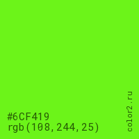 Цвет #6CF419 в цветовой модели RGB обозначается тремя октетами (108, 244, 25) в десятичном формате и #6CF419 в шестнадцатиричном (hex) формате, которые являются интенсивностью красного 108 (hex 6C), интенсивность зелёного 244 (hex F4) и интенсивность синего 25 (hex 19).