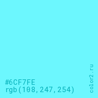 Цвет #6CF7FE в цветовой модели RGB обозначается тремя октетами (108, 247, 254) в десятичном формате и #6CF7FE в шестнадцатиричном (hex) формате, которые являются интенсивностью красного 108 (hex 6C), интенсивность зелёного 247 (hex F7) и интенсивность синего 254 (hex FE).