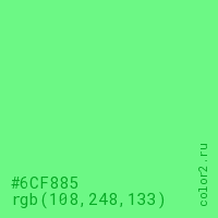 Цвет #6CF885 в цветовой модели RGB обозначается тремя октетами (108, 248, 133) в десятичном формате и #6CF885 в шестнадцатиричном (hex) формате, которые являются интенсивностью красного 108 (hex 6C), интенсивность зелёного 248 (hex F8) и интенсивность синего 133 (hex 85).