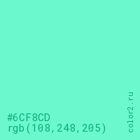 Цвет #6CF8CD в цветовой модели RGB обозначается тремя октетами (108, 248, 205) в десятичном формате и #6CF8CD в шестнадцатиричном (hex) формате, которые являются интенсивностью красного 108 (hex 6C), интенсивность зелёного 248 (hex F8) и интенсивность синего 205 (hex CD).