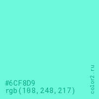 Цвет #6CF8D9 в цветовой модели RGB обозначается тремя октетами (108, 248, 217) в десятичном формате и #6CF8D9 в шестнадцатиричном (hex) формате, которые являются интенсивностью красного 108 (hex 6C), интенсивность зелёного 248 (hex F8) и интенсивность синего 217 (hex D9).