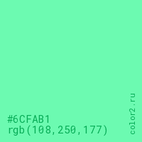 Цвет #6CFAB1 в цветовой модели RGB обозначается тремя октетами (108, 250, 177) в десятичном формате и #6CFAB1 в шестнадцатиричном (hex) формате, которые являются интенсивностью красного 108 (hex 6C), интенсивность зелёного 250 (hex FA) и интенсивность синего 177 (hex B1).