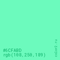 Цвет #6CFABD в цветовой модели RGB обозначается тремя октетами (108, 250, 189) в десятичном формате и #6CFABD в шестнадцатиричном (hex) формате, которые являются интенсивностью красного 108 (hex 6C), интенсивность зелёного 250 (hex FA) и интенсивность синего 189 (hex BD).