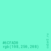 Цвет #6CFAD0 в цветовой модели RGB обозначается тремя октетами (108, 250, 208) в десятичном формате и #6CFAD0 в шестнадцатиричном (hex) формате, которые являются интенсивностью красного 108 (hex 6C), интенсивность зелёного 250 (hex FA) и интенсивность синего 208 (hex D0).