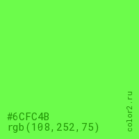 Цвет #6CFC4B в цветовой модели RGB обозначается тремя октетами (108, 252, 75) в десятичном формате и #6CFC4B в шестнадцатиричном (hex) формате, которые являются интенсивностью красного 108 (hex 6C), интенсивность зелёного 252 (hex FC) и интенсивность синего 75 (hex 4B).