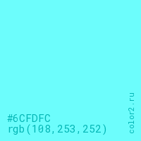 Цвет #6CFDFC в цветовой модели RGB обозначается тремя октетами (108, 253, 252) в десятичном формате и #6CFDFC в шестнадцатиричном (hex) формате, которые являются интенсивностью красного 108 (hex 6C), интенсивность зелёного 253 (hex FD) и интенсивность синего 252 (hex FC).