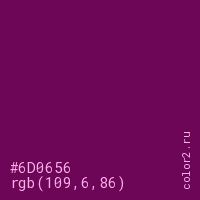 Цвет #6D0656 в цветовой модели RGB обозначается тремя октетами (109, 6, 86) в десятичном формате и #6D0656 в шестнадцатиричном (hex) формате, которые являются интенсивностью красного 109 (hex 6D), интенсивность зелёного 6 (hex 06) и интенсивность синего 86 (hex 56).