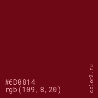 Цвет #6D0814 в цветовой модели RGB обозначается тремя октетами (109, 8, 20) в десятичном формате и #6D0814 в шестнадцатиричном (hex) формате, которые являются интенсивностью красного 109 (hex 6D), интенсивность зелёного 8 (hex 08) и интенсивность синего 20 (hex 14).