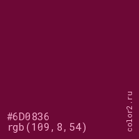 Цвет #6D0836 в цветовой модели RGB обозначается тремя октетами (109, 8, 54) в десятичном формате и #6D0836 в шестнадцатиричном (hex) формате, которые являются интенсивностью красного 109 (hex 6D), интенсивность зелёного 8 (hex 08) и интенсивность синего 54 (hex 36).