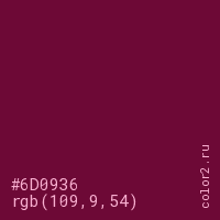 Цвет #6D0936 в цветовой модели RGB обозначается тремя октетами (109, 9, 54) в десятичном формате и #6D0936 в шестнадцатиричном (hex) формате, которые являются интенсивностью красного 109 (hex 6D), интенсивность зелёного 9 (hex 09) и интенсивность синего 54 (hex 36).