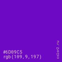 Цвет #6D09C5 в цветовой модели RGB обозначается тремя октетами (109, 9, 197) в десятичном формате и #6D09C5 в шестнадцатиричном (hex) формате, которые являются интенсивностью красного 109 (hex 6D), интенсивность зелёного 9 (hex 09) и интенсивность синего 197 (hex C5).