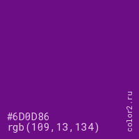Цвет #6D0D86 в цветовой модели RGB обозначается тремя октетами (109, 13, 134) в десятичном формате и #6D0D86 в шестнадцатиричном (hex) формате, которые являются интенсивностью красного 109 (hex 6D), интенсивность зелёного 13 (hex 0D) и интенсивность синего 134 (hex 86).