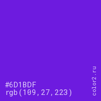 Цвет #6D1BDF в цветовой модели RGB обозначается тремя октетами (109, 27, 223) в десятичном формате и #6D1BDF в шестнадцатиричном (hex) формате, которые являются интенсивностью красного 109 (hex 6D), интенсивность зелёного 27 (hex 1B) и интенсивность синего 223 (hex DF).
