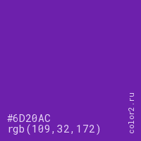 Цвет #6D20AC в цветовой модели RGB обозначается тремя октетами (109, 32, 172) в десятичном формате и #6D20AC в шестнадцатиричном (hex) формате, которые являются интенсивностью красного 109 (hex 6D), интенсивность зелёного 32 (hex 20) и интенсивность синего 172 (hex AC).