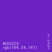 Цвет #6D22C5 в цветовой модели RGB обозначается тремя октетами (109, 34, 197) в десятичном формате и #6D22C5 в шестнадцатиричном (hex) формате, которые являются интенсивностью красного 109 (hex 6D), интенсивность зелёного 34 (hex 22) и интенсивность синего 197 (hex C5).