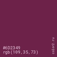 Цвет #6D2349 в цветовой модели RGB обозначается тремя октетами (109, 35, 73) в десятичном формате и #6D2349 в шестнадцатиричном (hex) формате, которые являются интенсивностью красного 109 (hex 6D), интенсивность зелёного 35 (hex 23) и интенсивность синего 73 (hex 49).