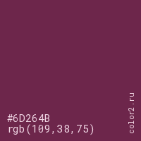 Цвет #6D264B в цветовой модели RGB обозначается тремя октетами (109, 38, 75) в десятичном формате и #6D264B в шестнадцатиричном (hex) формате, которые являются интенсивностью красного 109 (hex 6D), интенсивность зелёного 38 (hex 26) и интенсивность синего 75 (hex 4B).